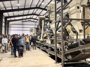 The technology for the station is not entirely new; there’s a high-capacity washer, de-husker, de-sticker, de-rocker, 15 stack dryers and a 70-foot truck scale. However, the custom design by Ed Charron of Willamette Ag Solutions is unique. The one-stop nut processor is in a single-line setup in a 10,000-square-foot building.