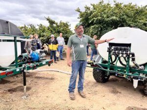 With the Ferrero chocolate high wearing off, I stopped by the hazelnut bakery showcase tent and loaded up on some carbohydrate-based nutrients, including nut cookies, toffee, granola, cakes and ganache, and my favorite from New Morning Bakery, Noel Bars. Conspicuously dusted with powdered sugar and now easily excitable, I made my way to the machinery demonstrations, including a sucker sprayer and two self-propelled sprayers. The HAV500, demonstrated by Matt Wood, reduces expenses by saving on fuel and time for refills. Marcel Moretti showed off the efficient new Exact sucker sprayer. These demos were among nearly three dozen vendors, including educational groups, who took part in the annual gathering.