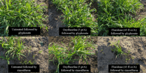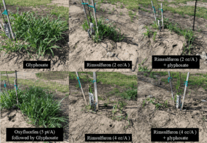 The primary takeaway from this research was that rimsulfuron applications in early March resulted in about a 50% reduction in johnsongrass weed coverage and biomass that lasted past the end of the study, which was in early May. This was a reduction relative to the control treatment with glyphosate alone, suggesting post-emergent absorption of rimsulfuron is likely not the primary mechanism of control but rather activity in the soil. Rates of 4 oz/A were much more effective than 2 oz/A, and the addition of glyphosate to the tank mix seemed to slightly increase efficacy.