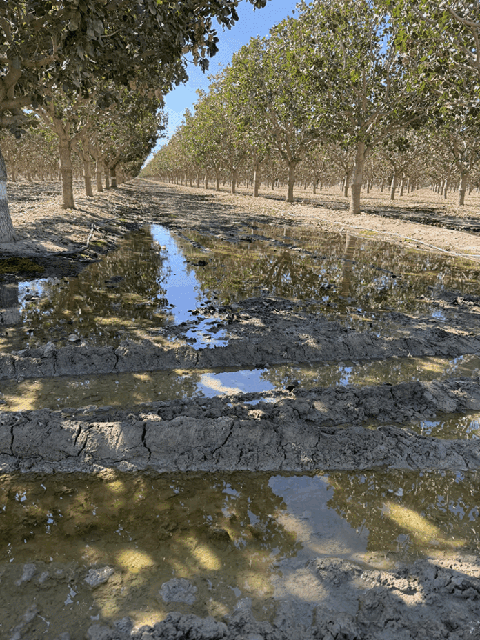 Ideally, every droplet of water that goes through the irrigation system will touch the soil surface, move down and out, and supply the necessary water to plant roots. This perfect example would meet the necessary evapotranspiration of the orchard without going above or below the cropsā needs. As we all know, farming is a blend of science and art because our world is perfectly imperfect, and we must work with what Mother Nature hands us. Each field is different based on the soil structure and chemistry within, the irrigation water that is applied to it, and the management of the land. Preventing ponding in a field is important because too much water will increase the risk for soilborne diseases, affect root health and eventually disrupt the productivity of the orchard.
