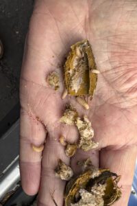 10 navel orangeworm larvae found in one almond mummy on the tree, a reason why orchard sanitation is crucial to lowering NOW populations (all photos by M. Machado.)