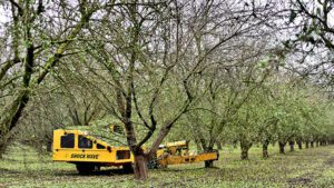 Differences between properly sanitized orchards and those that received no or only cursory sanitation are obvious, said Hicks. He said orchards that were properly sanitized after harvest were yielding loads of nuts with low reject levels. Those orchards that were not sanitized had much higher reject levels. Hicks said his winter sanitation plan is to shake on days with very high humidity, even if it is later in the year. The added weight on the mummy nuts from the moisture leads to a cleaner shake. He stops shaking during dry periods. Hicks notes that sweeping mummy nuts into windrows and flail mowing to destroy the mummies is essential.
