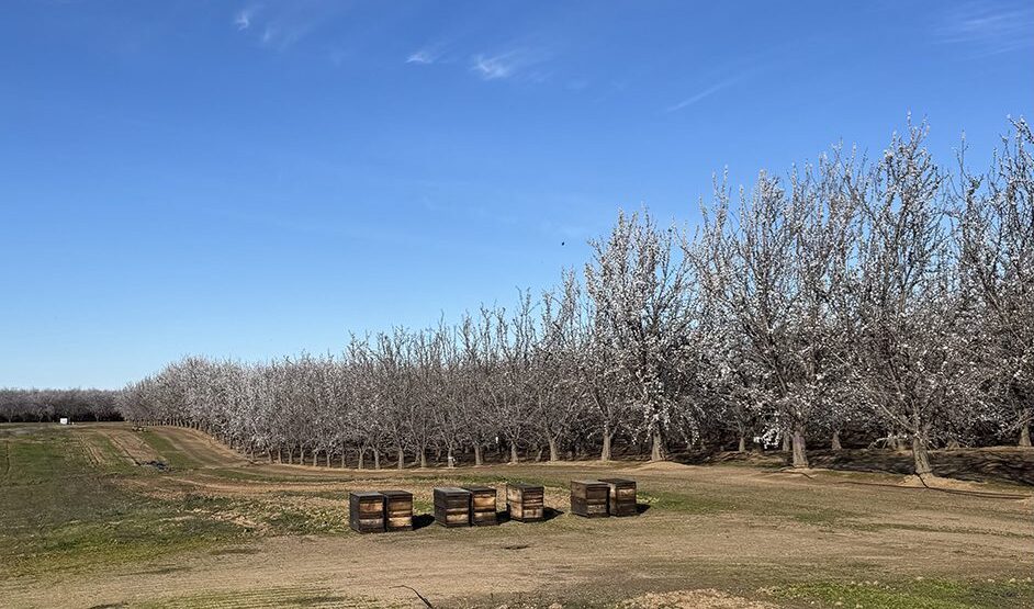 Profitable almond growing requires good bee activity in the orchard during bloom. Current hive stocking recommendations are at least two strong hives (at least eight frames of bees per hive) for self-infertile orchards and half to one strong hive per acre in self-fertile orchards. As self-fertile plantings continue to increase, talking with your beekeeper about hive placement to ensure best pollination of your acres, especially in cold or wet bloom weather, might be worth considering.