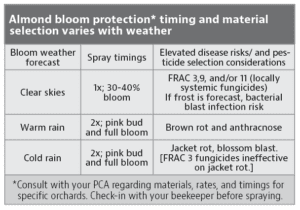 Working with your PCA, plan almond bloom fungicides to match bloom weather conditions. The following information is from the work of Dr. Jim Adaskaveg, UC Riverside. Blossom brown rot is always a focus, but other disease concerns vary with rainfall and temperatures.