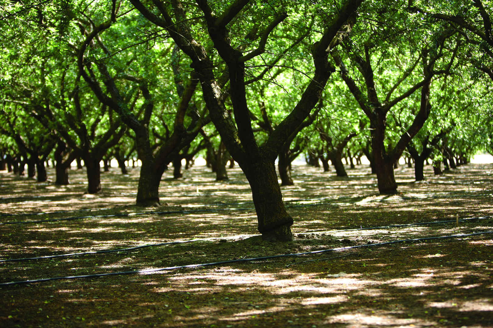 Drip irrigation lines run through a Central Valley tree nut orchard. Fertilizer use and nitrogen management practices are under review by the State Water Resources Control Board’s ILRP Expert Panel (Photo courtesy Almond Board of California.)