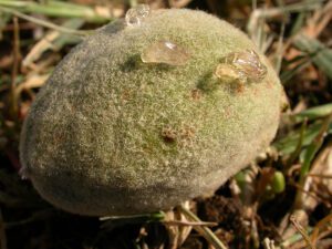 Gumming on a young almond nut is a sign of feeding damage from leaffooted plant bugs, an early season pest in some orchards. Monitoring orchard edges in March and April can help detect infestations before damage spreads (Photo by David Haviland, courtesy University of California Statewide IPM Program.)