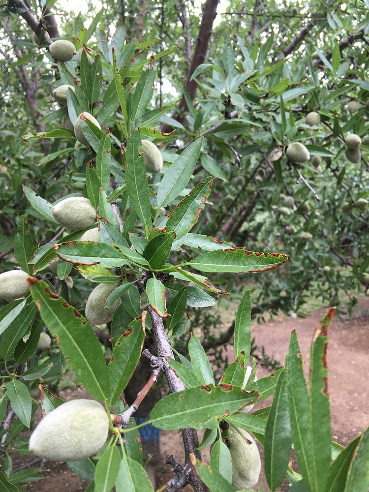 Leaf edge burn and marginal necrosis are symptoms of potassium deficiency in a Butte almond tree. Maintaining adequate potassium levels through fertigation and monitoring leaf tissue helps support crop development and spur health (Photo by Franz Niederholzer.)