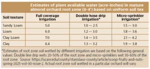 How best to hit the sweet spot of just-right spring irrigation? Soil moisture and ET based values are the current recommended practices. I have included a table with general amounts of soil moisture held in the root zone (4 feet deep) under different irrigation systems and soil textures. These values are a starting point to gauge the maximum amount of water to apply in each irrigation set when using the ET approach. Applying less than the maximum amount of water the soil will hold under an irrigation system literally gives roots some breathing room. It is a process to be worked out for each orchard, but well worth the effort.