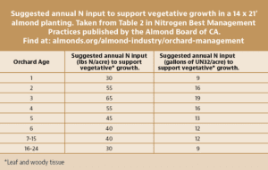 Good nut set means strong nitrogen (N) and potassium (K) demand to grow the crop and maintain spur growth and health for future crops. Feeding both a good crop this year and spur growth for next year’s buds means solid nitrogen programs in April. 80% of almond nuts grow on spurs. Spur growth tends to slow by May in mature, well-cropped orchards. Don’t miss spring N for spur growth and continued bearing surface next year.