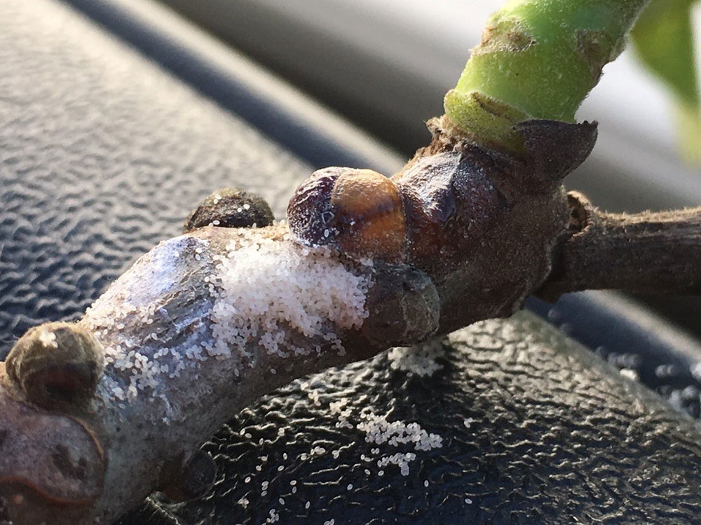 UC IPM Pest Management Guidelines advise growers and crop consultants to monitor scaffolds, limbs, branches and prunings in the dormant period for San Jose scale, Italian pear scale and, most prominently, for walnut scale and frosted scale. At high populations, walnut and frosted scales can reduce yields and quality and create issues with other plant pests, particularly Botryosphaeria.