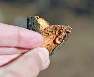 Nuts damaged by stink bug feeding will exude gummy material from the puncture site. Kernels of damaged nuts either become wrinkled and misshapen, or if already hardened before bug damage, will contain a black spot at the puncture site.